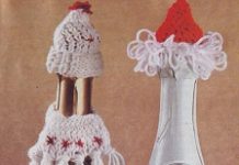 Для того чтобы связать подобный убранство для бутылки шампанского вам потребуются: остатки пряжи белого и алого краски средней толщины. Спицы №2,5 и крючок №3,5....