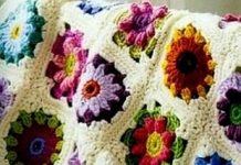 Плед из квадратных цветочных мотивов связан крючком. Схема вязания пледа крючком.